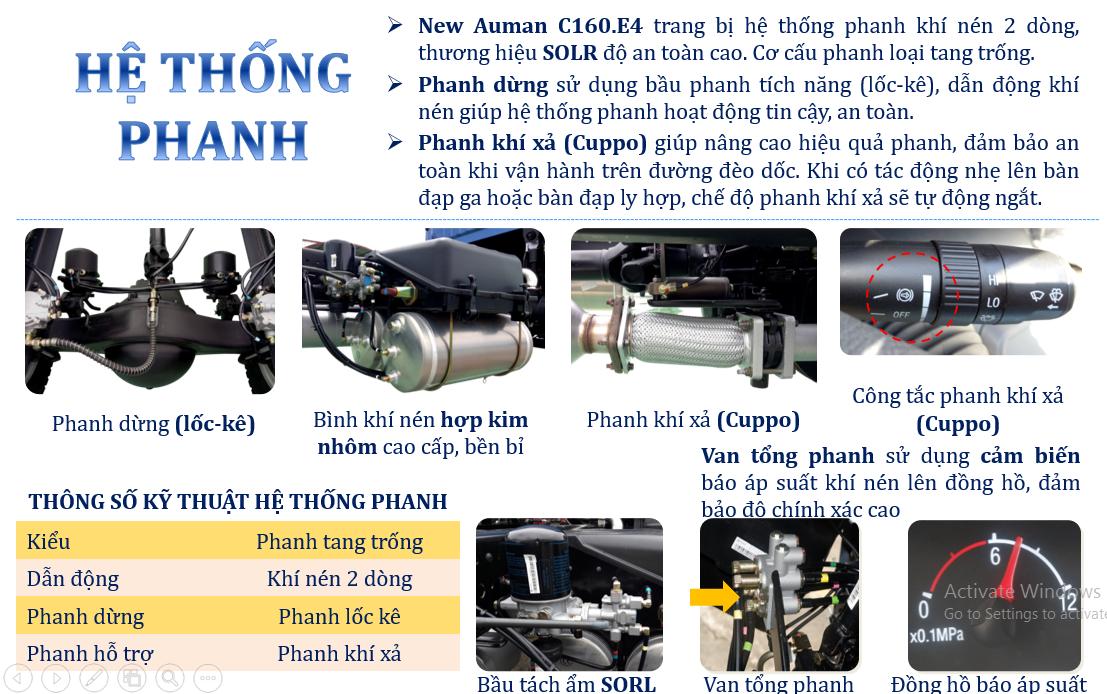 - – Hệ thống phanh: Phanh tang trống, dẫn động khí nén 2 dòng, phanh tay locked, phanh khí xả.