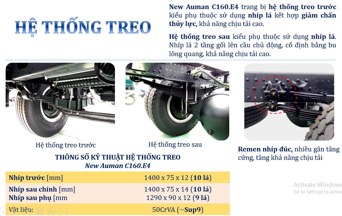 - – Hệ thống treo : Hệ thống treo trước sử dụng nhíp lá (10 lá) kết hợp giảm chấn thủy lực. Hệ thống treo sau nhíp lá 2 tầng (19 lá) gối lên cầu chủ động cố định bằng bu lông quang => giúp xe Auman C160 chịu được tải trọng cao.