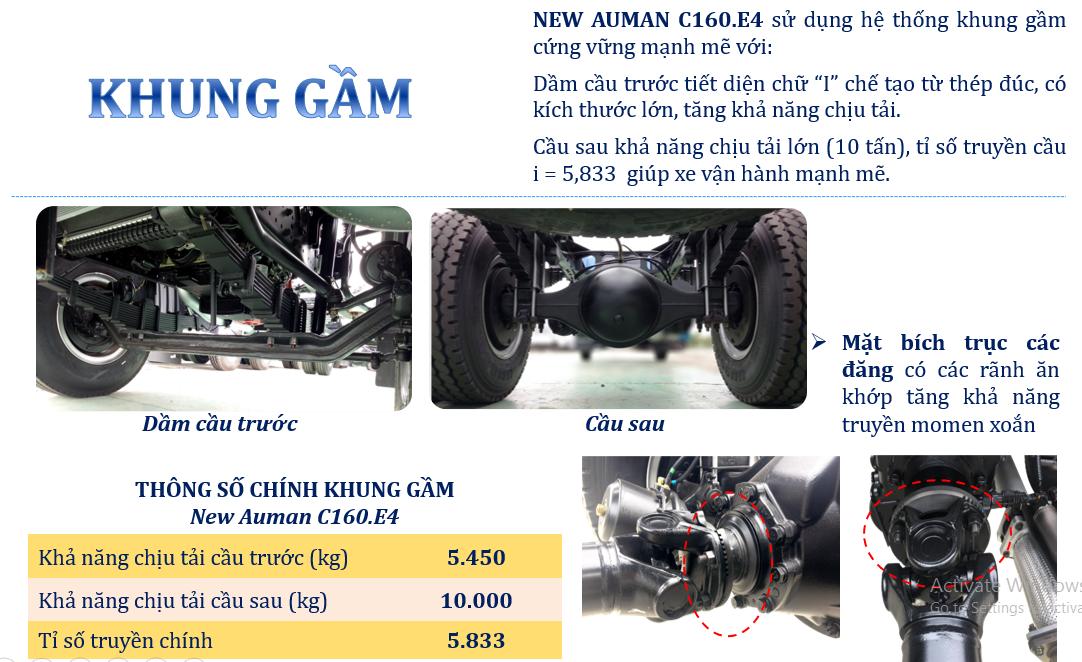 - – Hệ thống khung gầm Auman C160: Dầm cầu trước chữ I chế tạo từ thép đúc, có kích thước lớn giúp tăng khả năng chịu tải. Cầu sau chịu tải lớn (10 tấn), tỉ số truyền cầu i=5,833 giúp xe vận hành mạnh mẽ.