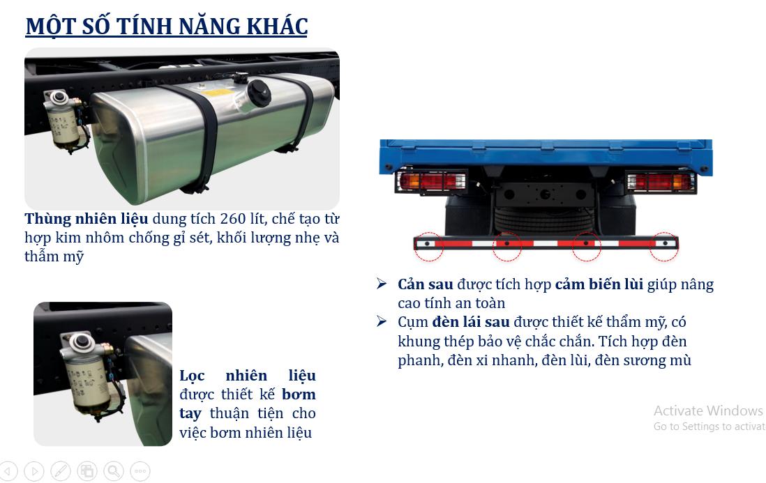 - – Một số tính năng khác: Thùng nhiên liệu 260 lít, hợp kim nhôm chống gĩ sét, tản nhiệt tốt. Cản sau tích hợp 4 camera lùi nâng cao tính an toàn, cụm đèn lái sau có khung thép bảo vệ chắc chắn.