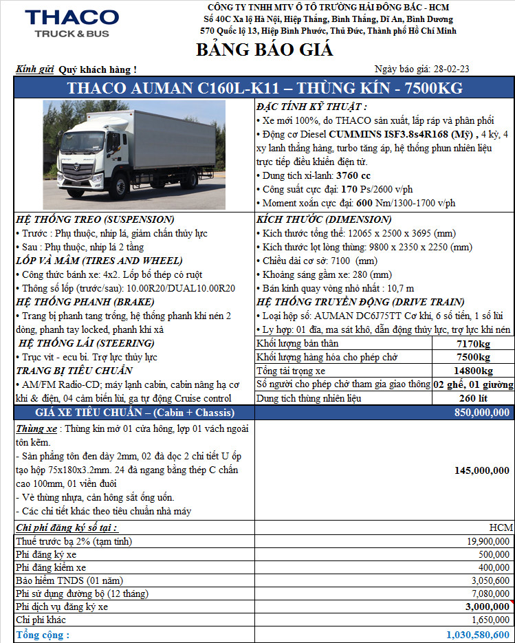 • Giá thùng kín C160L (mở 01 cửa hông,02 cửa sau): 145tr