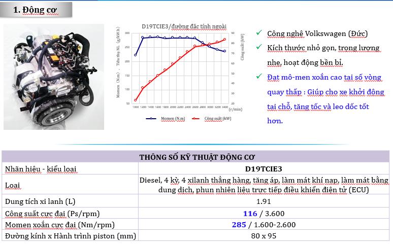 • Động cơ D19TCIE3, có công suất cực đại 116ps/3600rpm,Mô men xoắn cực đại: 285/1600-2600rpm
