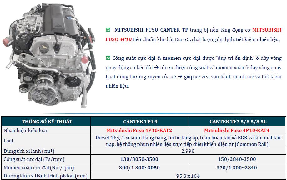 - Động cơ : Fuso Canter TF4.9 trang bị động cơ 4P10-KAT2 Euro 5, phun dầu trực tiếp điều khiển điện tử (ECU) dung tích máy 2998cc, công suất cực đại 130ps/3500rpm, mo men xoắn cực đại 300N.m/1300rpm