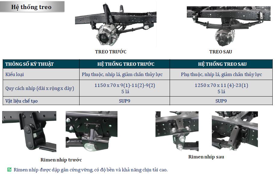 - Hệ thống treo : Phụ thuộc, nhíp lá, giảm chấn thủy lực, 05 lá nhíp vật liệu SUP9