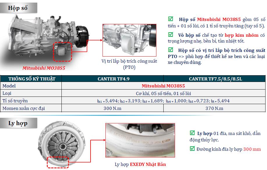 - Hộp số : Nhãn hiệu Mitsubishi M038S5, 05 số tiến, 01 số lùi