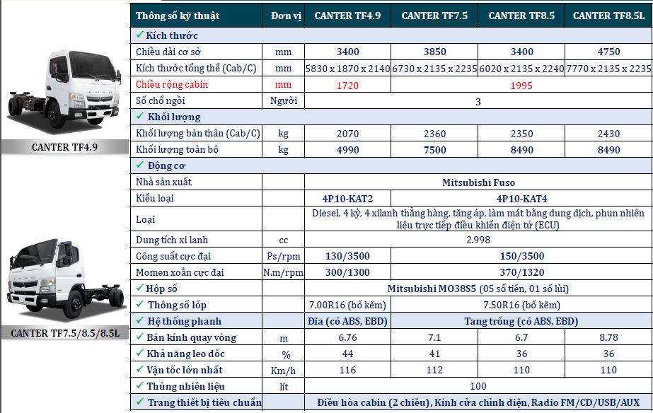 • Canter TF7.5: 3.4 tấn, thùng dài 5.2m